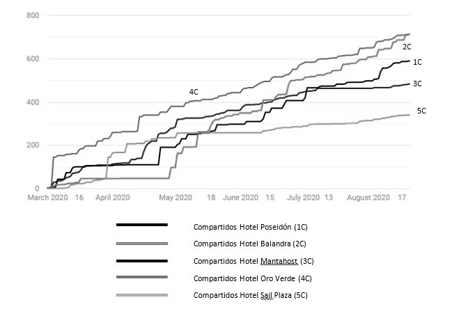 El hotel Oro Verde posee el mayor número de sugerencias (compartidos) en sus publicaciones durante el período de emergencia (717), seguido muy de cerca por el hotel Balandra (712), esto representa alrededor del 20 % más que el hotel Poseidón (590 comparticiones) a pesar del mayor número de publicaciones y número de fans que posee este último establecimiento (Tabla 6). Ante esto se observa que el número de seguidores y la cantidad de publicaciones no condicionan la variable Sugerencia (publicaciones compartidas).