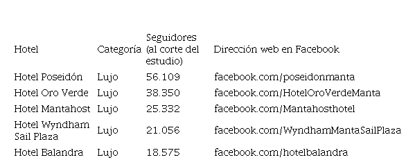 En el marco de las afectaciones causadas por la pandemia del COVID-19 detectadas en la ciudad de Manta, Félix y García Reinoso (2020) determinaron que una de las estrategias de reactivación turística, es la promoción en redes sociales. En este contexto, el propósito de esta investigación es evaluar el uso de Facebook en la promoción de hoteles categoría lujo de Manta durante la pandemia del COVID-19, tomando en consideración la interacción con los usuarios de esta red social, para medir por una parte el nivel de engagement de los usuarios con cada una de las marcas y, por otra parte, las opiniones vertidas a través de los comentarios efectuados en cada una de las publicaciones durante la emergencia sanitaria.