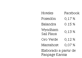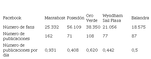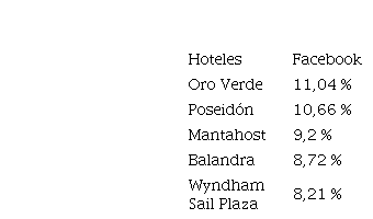El hotel Oro Verde presenta el porcentaje más elevado en respuestas a sus publicaciones en relación con el número de seguidores con un 11,04 % seguido del hotel Mantahost con un porcentaje del 10,66 %. Esta ratio muestra la calidad de la publicación presentada por los hoteles en su página de Facebook y cuánto de esa información es de interés de los seguidores en dicha red social (Tabla 4).