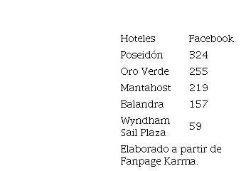Al corte de esta investigación, se determinó que los hoteles con mayor número de seguidores en esta red social son Poseidón con 56.638, seguido por el hotel Oro Verde con 39.436, mientras que los de menor número fueron Mantahost con 26.067, Wyndham Sail Plaza con 22.389, y Balandra con 18.575. La aplicación del modelo PRGS, demostró independencia en el resultado de sus variables, donde los valores encontrados en cada una de ellas, no está condicionado por el número de seguidores que contienen sus páginas. De los datos obtenidos a través de la plataforma Fanpage Karma, se concluye que los hoteles presentaron ausencias prolongadas y baja actividad en Facebook durante el tiempo de la emergencia sanitaria, provocando un bajo nivel de interacción entre la marca y sus fans.