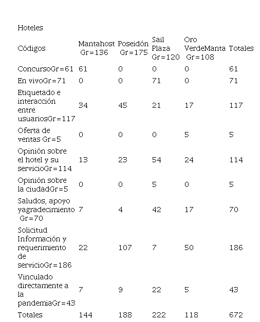 En el análisis cualitativo mediante el programa Atlas.Ti 9, de los comentarios realizados (c) por los seguidores de las páginas de los hoteles categoría de lujo de Manta, se determinaron 9 códigos en relación a concurso (61c); en vivo (71c); etiquetado e interacción entre usuarios (142c); oferta de ventas (5c); opinión sobre hotel y sus servicios (143c); opinión de la ciudad (6c); saludos, apoyo y agradecimiento (81c); solicitud de información y requerimiento de servicios (222c); y vinculados a la pandemia (49c). De acuerdo con este estudio, el hotel Poseidón tuvo más oportunidades de monetizar sus servicios, presentando el mayor número de comentarios (107c) con relación al código solicitud de información y requerimiento de servicios. Por el contrario, el hotel Wyndham Sail Plaza, aunque generó el mayor número total de comentarios (222c) por encima de los otros hoteles, no supusieron un verdadero interés por la adquisición de servicios, debido a que la mayoría se identificaron bajo el código en vivo, y solo siete bajo solicitud de información y requerimiento de servicios. En este sentido, se infiere que los concursos promovidos a través de Facebook no generan un incremento de engagement con la marca, por lo tanto, los hoteles deben crear contenidos que generen interés en la solicitud de información para promover sus ventas.