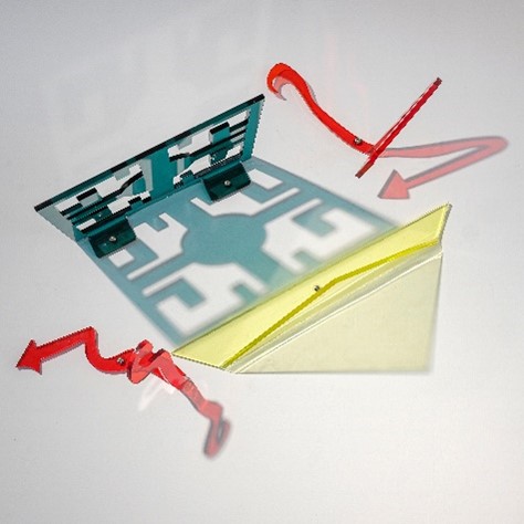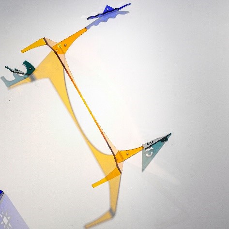 En el mezanine se encuentran otras piezas de esta misma serie, donde se presenta un proceso de síntesis de las formas y abstracción de elementos ligados a lo astronómico y a las culturas prehispánicas (Figura 8, 9, 10, 11, 12, y 13). Estas piezas instaladas se activan con la luz, a modo de reloj solar. La luz solar deviene elemento orgánico y activo de la obra, se manifiesta como estructura viviente, retomando una cualidad andina de espacio-tiempo específico o yanantin-tinku pacha.