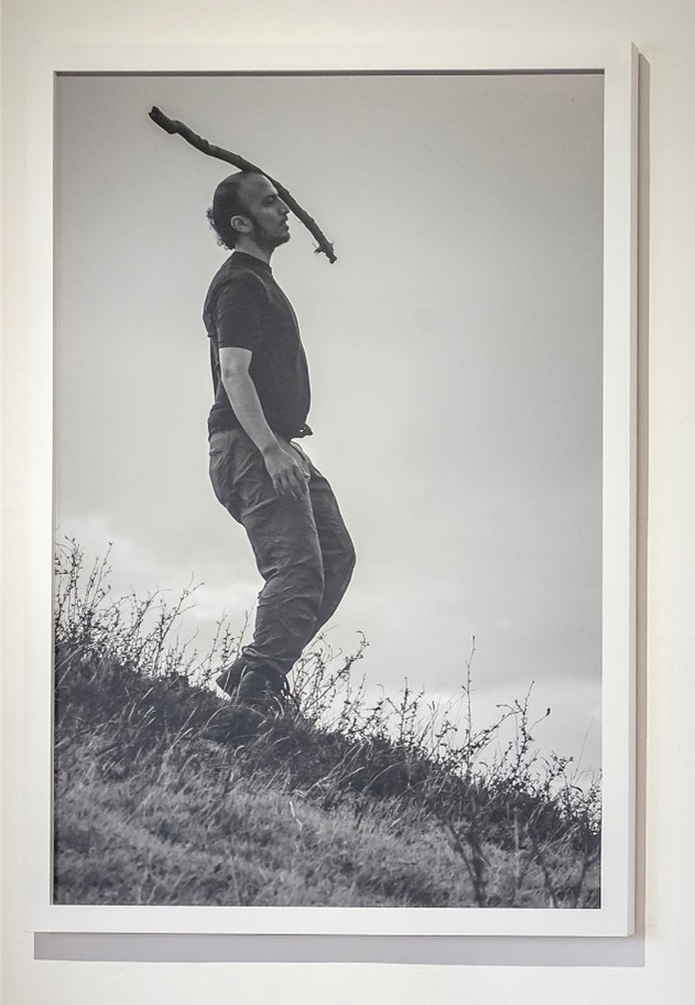 ¿Equidistancias? (2013) se trata de una fotografía de registro de una caminata que el artista realiza por la rampa de la Tola (pirámide trunca) número cinco del sitio arqueológico y observatorio astronómico Kitu-karanki de Kochaskí (del kichwa: laguna de la mitad). Allí, el artista intenta equilibrar sobre su cabeza una vara de madera, insinuando la idea de un cuerpo-mundo en búsqueda del equilibrio, considerando la complejidad de conseguirlo (Figura 14). Su cuerpo se transforma en una herramienta de medición y comprensión de estos espacios, cargados de energías. Este sitio también se ubica sobre la línea equinoccial, y representa la idea de equilibrio asociada a lo equidistante. En el ordenamiento territorial y urbanismo andino existe una noción de que el territorio es un cuerpo: corporizar el territorio puede remitir a una búsqueda de relaciones de reciprocidad con la naturaleza, más allá de lo frágil y complejo que resulta conseguir y mantener ese balance; además, pone en tensión la idea de frontera tal como la concebimos.