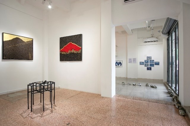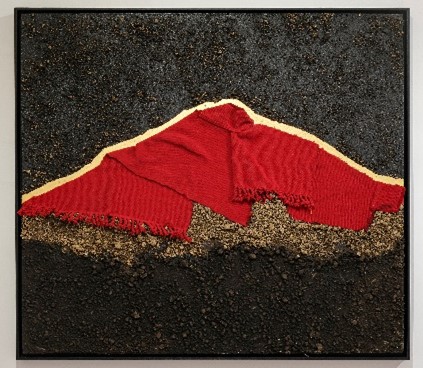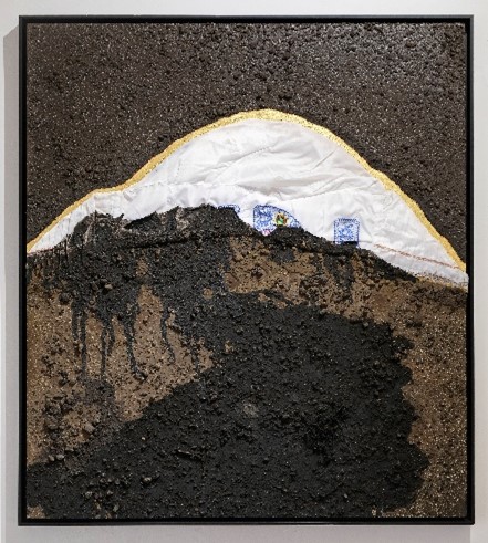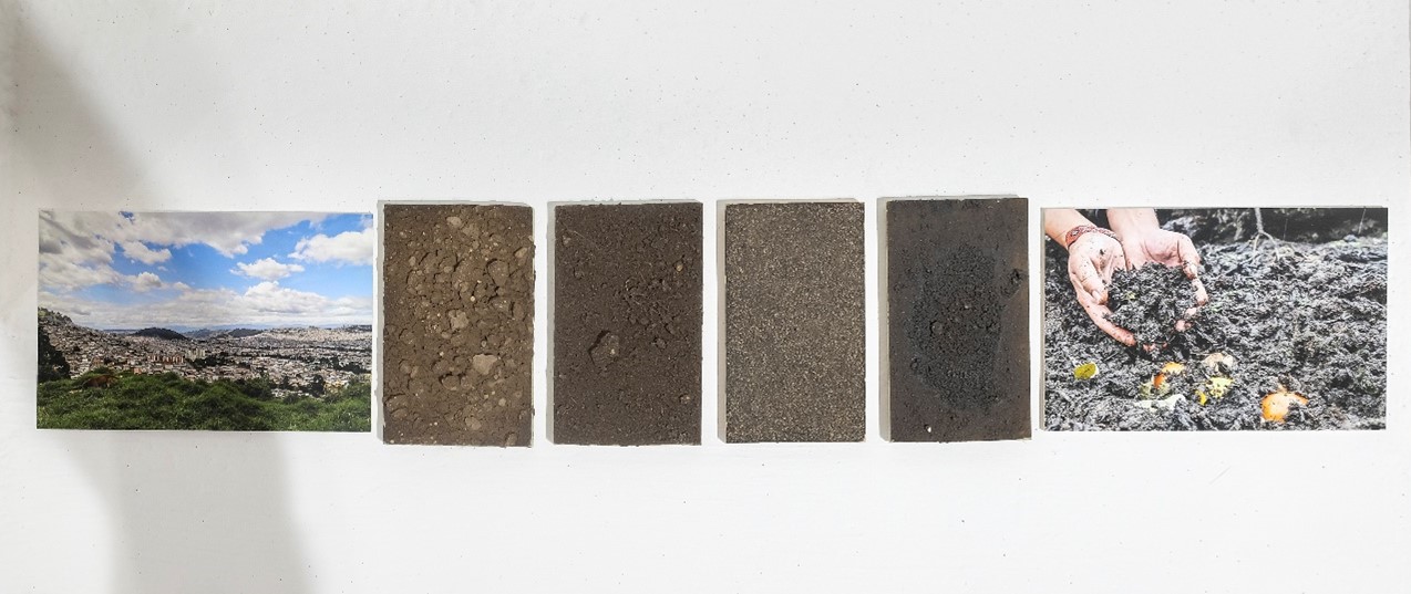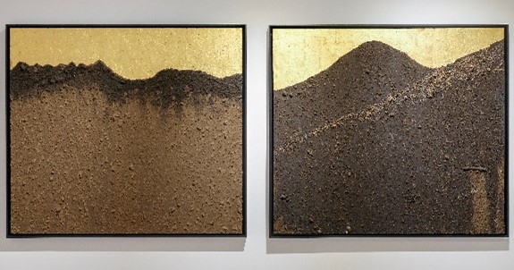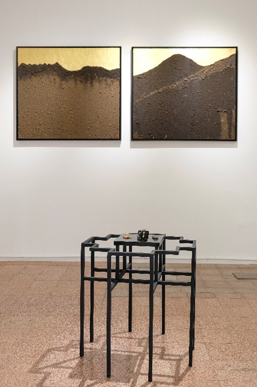 La serie Apus solares (2023) se conforma por pinturas realizadas a partir del uso de tierras que el artista recoge de las montañas-volcanes Atacazo y Cayambe; Cerro Puntas y Ungüí (Figura 15, 16, 17, y 18), que Macas identifica como apus o ancestros, seres vivos que se conectan lumínicamente durante los solsticios y equinoccios, en los amaneceres y atardeceres respectivamente. Es una obra-ofrenda, pues el artista toma ritualmente la tierra de los apus, reivindicando una visión no extractivista basada en el principio de reciprocidad, como base de la vida (Figura 19). No es coincidencia que hayamos presentado esta exposición en una de estas fechas: en el solsticio del 21 de diciembre.