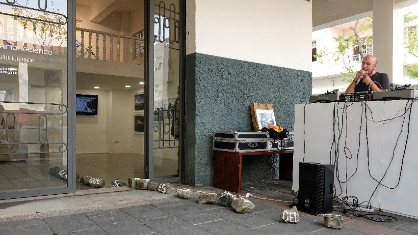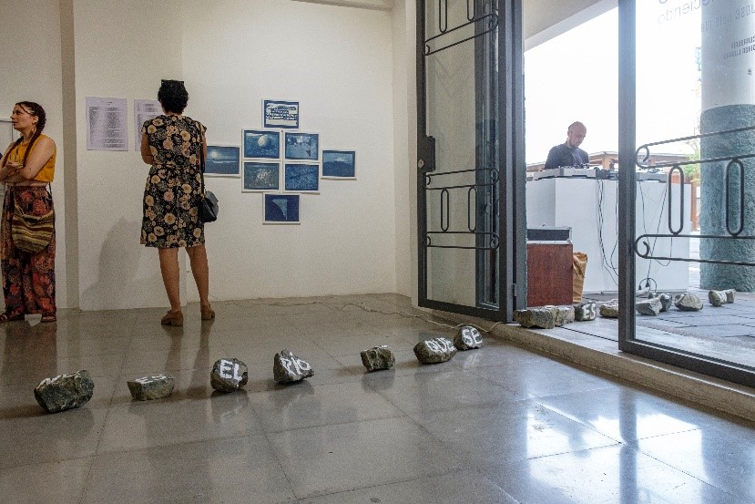 Específicamente para esta exposición el artista realiza la obra No es el río lo que se mira (2023), donde utiliza la pintura sobre piedras para generar una imagen poética que busca unir lo geográfico con lo sagrado, en este caso el espacio de la galería y el río Guayas. Para esta obra trabaja a partir del caminar situado, atento, consciente con el paisaje y sus energías, lo que le permite conectarse desde los afectos (Figura 20 y 21). Esta conexión es la que Macas busca, proponiendo en Guayaquil esta acción-intervención que ya ocurrió en Bolivia, en el sitio arqueológico de Pumiri–Oruro, titulada No es la montaña la que se mira, donde la idea de caminata llevó al artista a recorrer las palabras del poeta boliviano Jaime Sáenz: No es la montaña lo que se mira, es la presencia de la montaña.