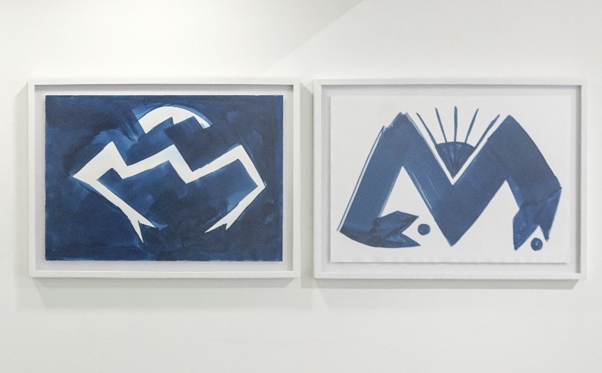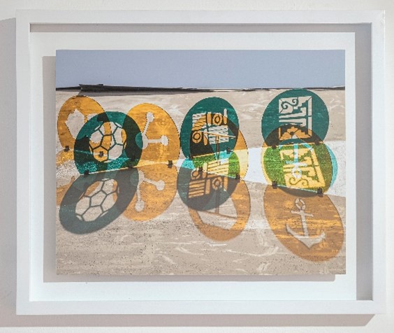 Achikyakushuyu (dibujos de sol y agua, 2023) se realizan empleando el químico utilizado para la revelación de cianotipos (Figura 5). Representan símbolos que derivan de la observación, como en la obra Genoma (2020) de la serie Luminancias (o Cromotopos) (2018-2023), una intervención con 61 piezas acrílicas realizada en el espacio público de la calle Panamá que configura una “genealogía gráfica guayaquileña”(Figura 6 y 7), desde lo precolombino hasta elementos de la cultura popular de la ciudad contemporánea, para evocar una secuencia de ADN que, en plena amenaza pandémica, recuerda la continuación de la vida manifestada en los ciclos del Sol en la Tierra.