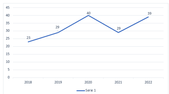 La productividad por años es una medida importante para evaluar la trayectoria de investigación, ya que permite identificar cambios en la producción científica a lo largo del tiempo. La figura 1 muestra la productividad en el período de tiempo analizado. Se aprecia un gráfico ascendente que en la productividad por años es una señal de que los autores están aumentando su actividad investigadora con relación a la temática de la gestión documental y está siendo más productivo con el tiempo. No obstante, el año de mayor productividad fue el 2020 con 40 trabajos, casi igualada en el 2022 con 39.
