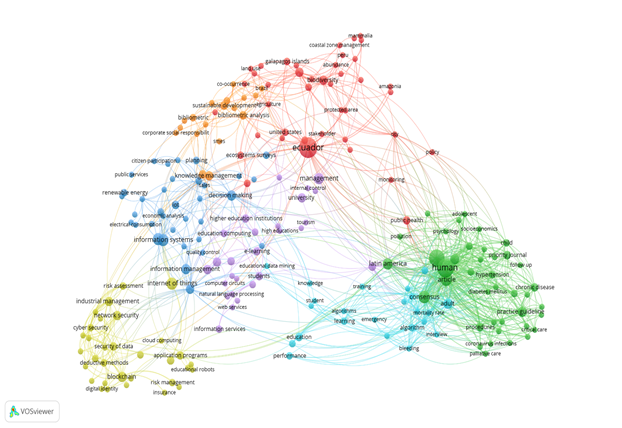 Otro aspecto a considerar en la figura 2 es la centralidad de los nodos que indica la importancia del término dentro de la red de co-ocurrencia. Los nodos con mayor centralidad representan las palabras clave más relevantes o importantes dentro de la colección de documentos. De manera que la palabra clave Ecuador, representada el nodo más grande y centrado (color rojo) y simboliza el término que más se repite en los documentos, esto se debe igualmente a la restricción de la búsqueda a la región. En la red en el cluster rojo se mencionan principalmente algunas regiones ecuatorianas.