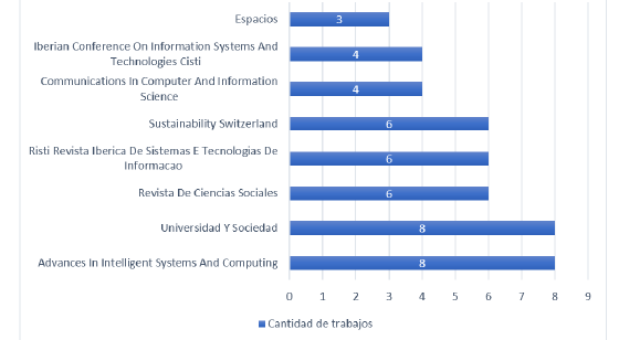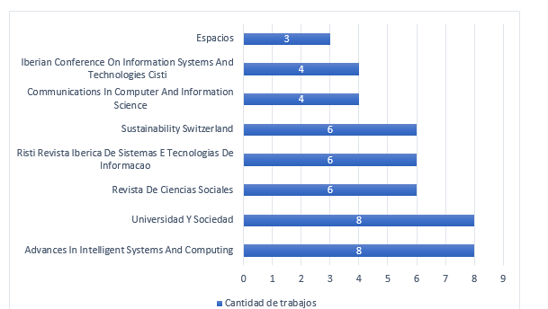La figura 3 representa las fuentes de publicación donde con mayor frecuencia publicaron autores ecuatorianos trabajos relacionados con la temática analizada. Al respecto, “Advances in Intelligent Systems and Computing” es una serie de libros y actas de conferencias publicadas por Springer que abarca temas relacionados con la inteligencia artificial, la informática y la ingeniería, poseyó la mayor cantidad de trabajos, un total de 8 al igual que "Universidad y Sociedad”, que es una revista cubana de carácter interdisciplinario y que publica temáticas relacionadas con las áreas de la vida social, ciencias humanísticas, económicas, técnicas. Seguido con 6 trabajos por tres revistas: Revista de Ciencias Sociales (Venezuela); Risti (Portugal); y Sustainability Switzerland (Suiza). Llama la atención que ninguna de las revistas analizadas pertenece a alguna institución de Ecuador.