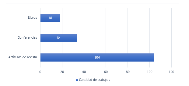 Las fuentes documentales se pueden clasificar en diferentes categorías según su tipo, para el caso de la investigación se analizaron los trabajos perecientes a tres tipologías: libros, conferencias y artículos de revista, cuyos resultados se muestran en la figura 5. Se observa que la mayoría de los trabajos han sido publicados en revistas científicas (66,67%), seguido de conferencias (21,79%) y en libros solamente el (11,54%). Se confirma que las revistas académicas son el medio de preferencia de los autores para la divulgación de los resultados de sus investigaciones.