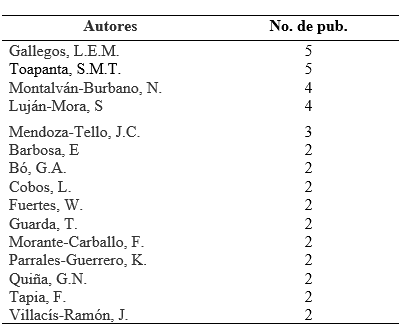 La productividad autoral se refiere al número de publicaciones que un autor ha producido en un período de tiempo determinado. Para este caso posibilitó conocer los autores de Ecuador que más han producido sobre la temática en los últimos 5 años. La tabla 1 muestra los nombres de los autores con dos publicaciones o más: