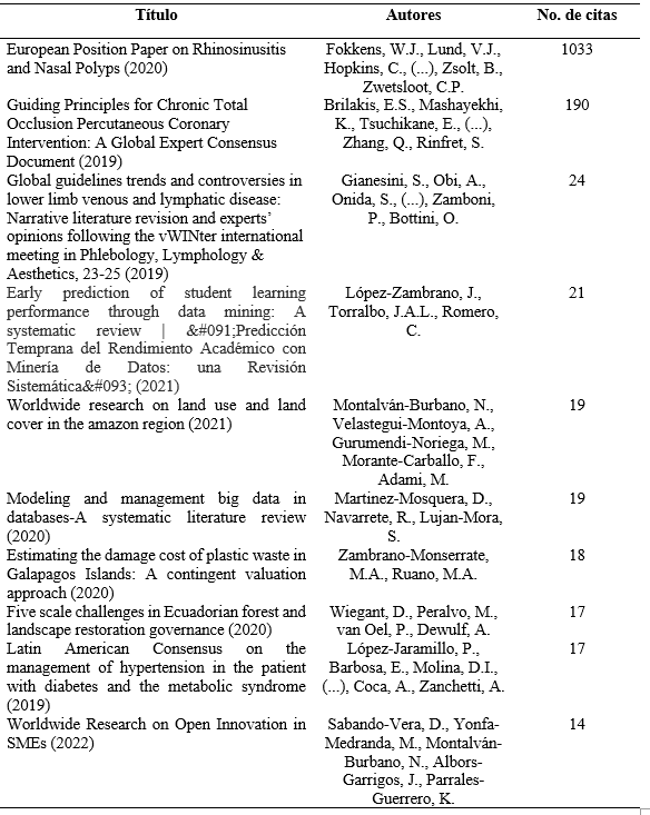 En la tabla 2 se muestran los trabajos más citados de la muestra, describiendo además su título y autores que lo realizaron: