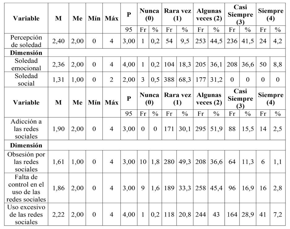 El análisis descriptivo muestra que, algunas veces, el 44.5 % (Me=2) de los adolescentes evaluados manifestó la presencia de percepción de soledad, y el 36.1 % señaló experimentar soledad emocional algunas veces (Me=2). Sin embargo, el 68.3 % de los estudiantes indicó una puntuación menor en soledad social (Me=1), lo cual significa que rara vez perciben este tipo de soledad (ver tabla 2).