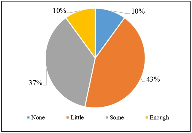 Ten percent of the participants (Figure 1) stated that they have no knowledge of teaching methodology, and 43% consider their knowledge to be limited. Thirty-seven percent fall into a medium level (neither much nor little), and the remaining 10% believe their knowledge of teaching methodology is sufficient.