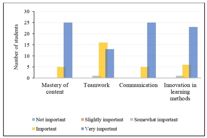 Despite this lack of knowledge, the students were able to identify four pedagogical skills: mastery of content, teamwork, communication skills, and innovation in learning methods (Figure 2).
