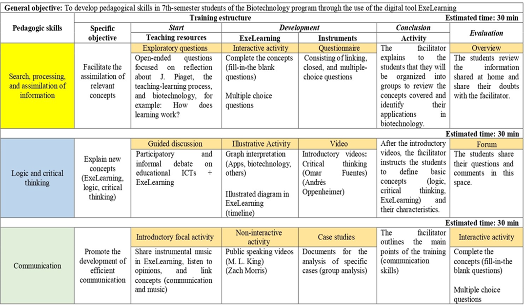 The general objective of the strategy is to develop pedagogical skills in seventh-semester students of the Biotechnology program through the use of the digital tool ExeLearning. It includes general and flexible activities to be carried out within the framework of the course "Plant Biotechnology," allowing educators to apply it within the objectives and content specific to the subject. The strategy aims at the development of three pedagogical skills with their corresponding specific objectives: