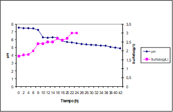 Las experiencias se realizaron adicionando 1.300 ppm de sulfuro de hidrógeno con un flujo de aire de 5 L/min al bioreactor. La medición de pH fue registrada por 42 horas. Para el caso de la determinación de la concentración sulfato, los datos fueron toman do cada dos horas hasta completar 24 horas.
