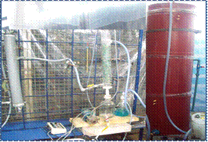La operación empezó, haciendo circular una corriente de aire, para verificar las fugas. El aire que se inyectó al sistema circuló previamente por una trampa de retención de líquidos (agua contaminada o lubricante) y un filtro (de carbón activado) para asegurar que no pasen partículas que contaminen el sistema. Luego se agregó a cada cilindro, el inóculo de lodo activado en una solución 3:1. Una vez que todo el sistema estaba en buenas condiciones, se generó el sulfuro de hidrógeno. Este gas se transportó por una corriente (flujo definido previamente) de aire hacia las etapas del biofiltro, en donde se trató de acuerdo a los parámetros operacionales fijados. El circuito se terminó conectando la salida del biofiltro con una trampa con sulfato de cobre, para detectar el sulfuro de hidrógeno (Fig. 7).