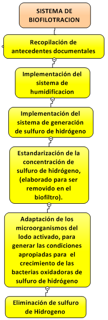 Para la puesta en marcha del sistema de biofiltración, se consideró: La preparación de material de soporte, la inoculación al compost, la preparación de los nutrientes para el compost y la operación del sistema de biofiltración. Cada una de estas etapas se ejecutó exitosamente, logrando un funcionamiento eficiente del sistema. Esto se refleja en el resultado final, que corresponde a remover 1.250 ppm y 1.300 ppm de sulfuro de hidrógeno, con una eficiencia del 100%.