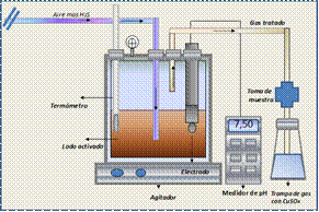 La Implementación del biorreactor se realizó, para la adaptación de los microorganismos, debido a que es un sistema en donde se pueden controlar las condiciones de crecimiento de las bacterias oxidadoras de sulfuro de hidrogeno. El sistema cuenta con la posibilidad de regular los flujos de gas en la entrada y salida, puesto que se producen diferencia de presiones, generando una pérdida de lodo activado desde el biorreactor. Este sistema debe ser desmontable y de fácil acceso para el control de las variables (Temperatura y pH).