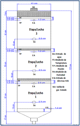 Cada cilindro fue implementado con un sistema de aspersión, para mantener la humedad al 60% y agregar periódicamente los nutrientes al compost. Los cilindros en el interior tienen una placa distribuidora de PVC, con agujeros de 5 mm, para el paso del sulfuro de hidrógeno a los respectivos lechos fijos.