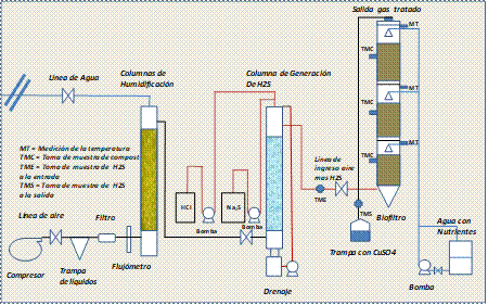 Con el propósito de construir un biofiltro piloto para la remoción de sulfuro de hidrógeno se diseñó un sistema piloto para la simulación de la eliminación del contaminante a través de los componentes que se detallan en el siguiente diagrama Fig.1: