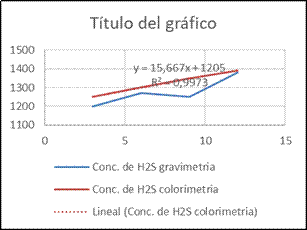 En las concentraciones obtenidas se puede observar, que el método gravimétrico mostró un promedio de concentraciones de sulfuro de hidrogeno de 1275 ppm y el método colorimétrico mostró un promedio de concentraciones de sulfuro de hidrogeno de 1317,5 ppm (Tabla 3 y Fig. 8). La diferencia se observa en la mejor linealidad (r= 0,998) de los datos del método colorimétrico respecto al gravimétrico.