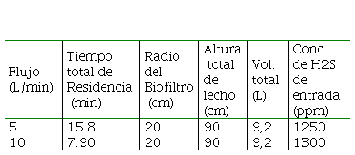 Se observa además que la remoción de sulfuro de hidrógeno es un 100%, es decir se degrada completamente las 1,300 ppm de gas. El biofiltro (figura 10) ha demostrado ser altamente eficaz en la eliminación de sulfuro de hidrógeno en flujos de 5 L/min y 10L/min que corresponden a tiempos de residencia de gas de 15.8 min y 7.9 min respectivamente. Se probó un 100% de eficiencia para todas las concentraciones de entrada ensayadas (tabla 5).