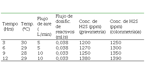 En relación al sistema generador de Sulfuro de Hidrógeno se obtuvieron los resultados esperados, puesto que los ensayos realizados probaron que la columna era eficiente para la generación de sulfuro de hidrógeno. Para obtener el sulfuro de hidrogeno la interacción entre los reactivos debe ser íntima, para lograr esto se agregaron esferas de vidrios en el interior de la columna [1]. Con respecto a esto se logró una instantánea formación del gas. Para asegurar que la generación de sulfuro de hidrógeno corresponde a las concentraciones fijadas en el estudio, se reguló el flujo de sulfuro de sodio y ácido clorhídrico y se midieron las concentraciones producidas de sulfuro de hidrógeno (Tabla 3).