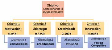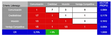 De lo anterior, se desprende que la encuesta permitió seleccionar los criterios y alternativas para la toma de decisiones, el modelo permite en primera instancia, elegir de cada criterio cual se considera más importante bajo una escala de valoración. De los resultados obtenidos se deriva que la alternativa dos (Credibilidad) da una ponderación de 0,37, seguida de la alternativa uno (Comunicación) con el 0,15, en tercer lugar la alternativa cuatro con 0,09 (ventaja competitiva), y finalmente la alternativa tres (Intuición) con el valor de 0.07. De lo que se colige, que la alternativa credibilidad del Líder es un factor que debe ser considerado en la toma de decisiones más que las otras alternativas.