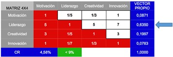 Los resultados del vector propio para los criterios, nos arroja el mayor peso a la segunda posición, es decir dentro de los cuatro criterios el liderazgo es más importante que la motivación, la creatividad y la innovación.