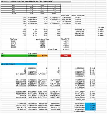 Es importante indicar que, el tamaño de la matriz para este caso es de (4X4) y no debe superar el ratio de consistencia de más del (9%), en el caso de que el valor sea mayor a dicho valor, la matriz es inconsistente, en la aplicación de este modelo obtuvimos un ratio de consistencia que es del 9 %.
