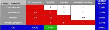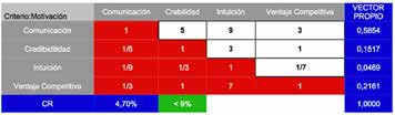 Para el efecto, el resultado de esta suma producto nos permite aplicar la teoría de la decisión que nos da como resultado la alternativa dos (Credibilidad) con una ponderación de 0,37, seguida de la alternativa uno (Comunicación) con el 0,15, en tercer lugar la alternativa cuatro con 0,09 (ventaja competitiva), y finalmente la alternativa tres (Intuición) con el valor de 0.07.