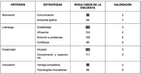 Con estos antecedentes, se clasificó y valoró de acuerdo al número de respuestas considerando los criterios y estrategias de la encuesta, para lo cual, se seleccionó como alternativas a las estrategias mejor puntuadas y se estableció las siguientes alternativas: comunicación, credibilidad, intuición y ventaja competitiva.