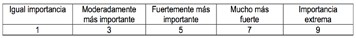 Dicha escala permite valorar criterios y alternativas, en base a dicha valoración se puede destacar que el valor mínimo es 1 considerado de igual importancia y el valor máximo es 9 considerado de importancia extrema, y las otras valoraciones intermedias son 3,5 y 7 respectivamente, dichas valoraciones, las vamos a cuantificar en las matrices que para él efecto vamos a desarrollar.