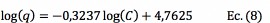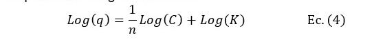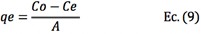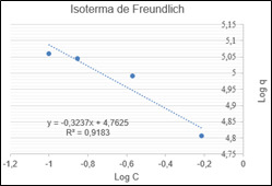 Del mismo modo, se calculó la isoterma de Freundlich R2=0,9183 con un y su ecuación final (Ec.8) representada en la Figura 5.
