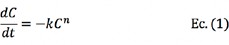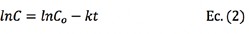Si n=1(reacción de primer orden), se obtiene la ecuación (2). Donde C0 es la concentración inicial del reactivo, k la constante de velocidad, y, es la concentración del reactivo pasado el tiempo t de reacción (Avery, 2002).
