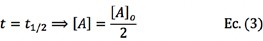 El tiempo de vida media de un reactivo es el tiempo necesario para que reaccione la mitad de su concentración inicial, expresado en la ecuación 3: