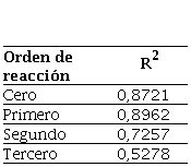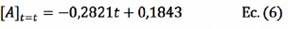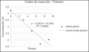 Se calculó los diferentes órdenes de reacción para el proceso realizado y se escogió el que mejor coeficiente de correlación (R2) presentó. Los órdenes de correlación se indican en la tabla 4. Un R2= 0,8962 a mejor cinética que se encuentra descrita por una ecuación de primer orden (Ec. 6), donde t es el tiempo y [A]t = t la concentración.