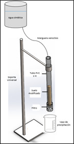 El suelo calcinado fue depositado al interior de un tubo PVC de 1 pulgada de diámetro, con un tamiz elaborado de nylon y papel filtro colocado en uno de sus extremos. En la parte superior de un soporte universal se instaló el envase plástico con agua sintética, en la mitad el tubo PVC con el suelo en su interior, ambos conectados mediante la manguera de venoclisis que permitió mantener un caudal constante. El agua filtrada se recolectó en un vaso de precipitación ubicado en la parte baja del soporte (Figura 1). Se tomaron muestras de 0,025 L del agua filtrada a diferentes intervalos de tiempo, la concentración de fosfatos de cada una de las muestras se midió con un espectrofotómetro HACH DR 5000TM UV-Vis (programa 490 del Handbook y λ = 880 nm), según el Método 2340-C del libro Standar Methods de la American Public Health Association (APHA, 2005).