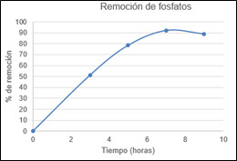 En total se tomaron 4 muestras del agua sintética filtrada, a intervalos de aproximadamente 2 h. Los resultados obtenidos se presentan en la tabla 3. Las concentraciones muestran una reducción de aproximadamente la mitad en cada una de las alícuotas analizadas, hasta alcanzar las 7 h. de filtrado, punto después del cual se satura el suelo y las concentraciones vuelven a incrementarse. La remoción de fosfato alcanzó un 92% (ver Figura 2), una mejora considerable en comparación al 40,05% de remoción del suelo sin modificación alguna, resultado que se obtuvo en el trabajo de Calvopiña y Vilela (2017) con el mismo suelo, resultado similar a lo obtenido en (Barzallo, Bayas, Yánez y Carrera, 2016). Este porcentaje (92%) es semejante a los registrados en (Bolaños, 2014) y (Velázquez y Caballero, 2014) quienes usan tecnosoles para la adsorción de fosfatos en cuerpos de agua. Además, se puede relacionar que el bajo contenido de materia orgánica, el pH y el contenido de óxidos de hierro y aluminio promueven una mejora en la adsorción de iones fosfatos como lo demostró (Prato et al., 2013).