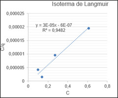 A partir de los valores de la tabla 3 y los calculados para la concentración de adsorbato se obtuvo la isoterma de la Langmuir como se puede ver en la Figura 4 con un R2=0,9482 con su respectiva ecuación en (Ec.7).