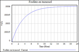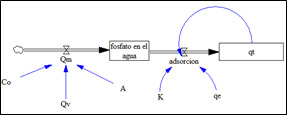 El modelamiento se realizó en el software libre Vensim PLE 7.0, que permitió visualizar el tiempo al cual el suelo modificado se saturó con los fosfatos presentes en el agua. El diagrama del modelo matemático se observa en la Figura 6. Las constantes usadas para el modelamiento con sus valores respectivos son: