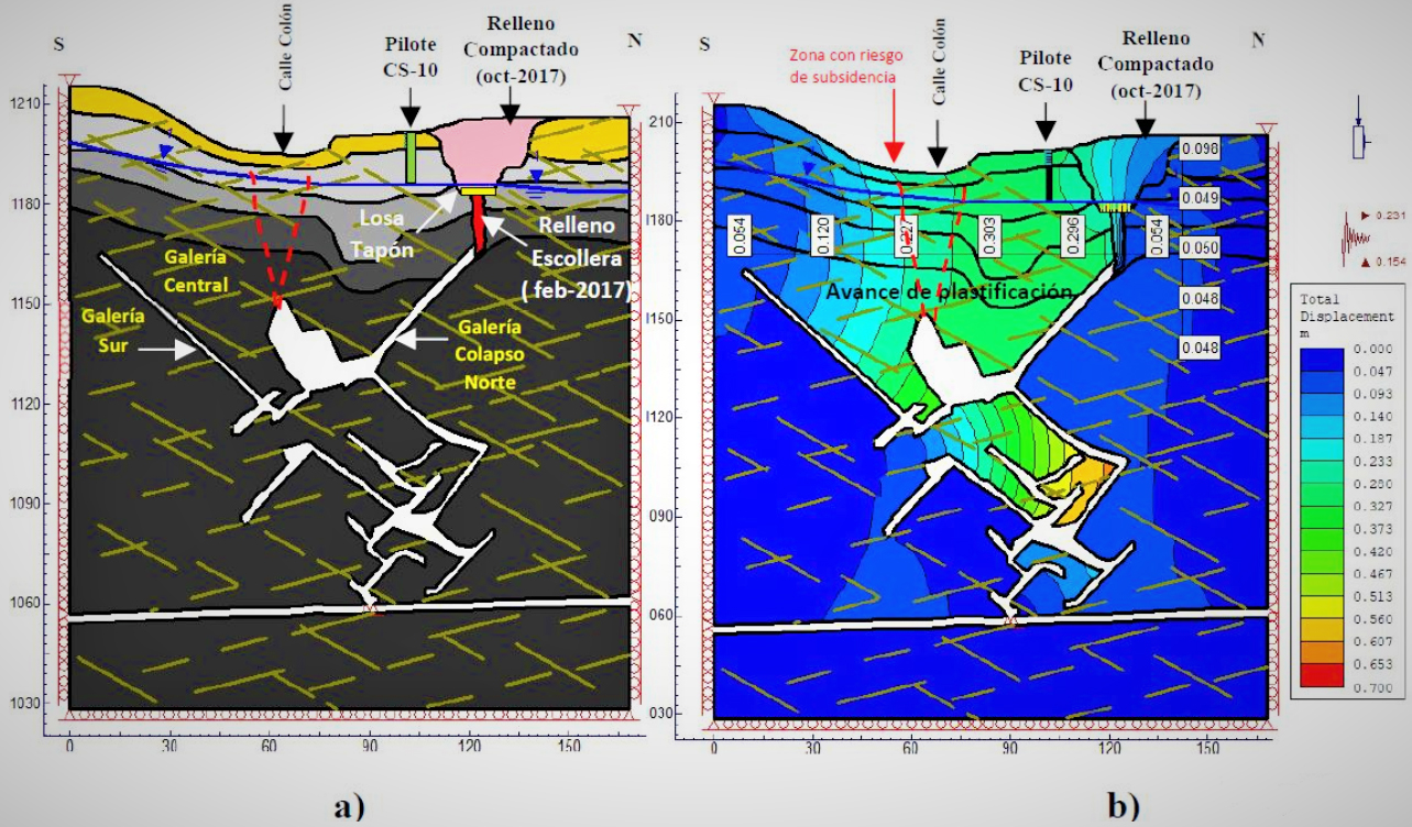 Figura 10 a) Modelo geológico con la ubicación de obras de mitigación; pilote, losa tapón y relleno compactado, b) Comportamiento de la deformación posterior a la implementación de obras de remediación, se destaca zona plastificada donde el macizo rocoso puede acelerar un fenómeno de subsidencia por cavidades de grandes dimensiones (Av. Colón y Ernesto A. Castro)