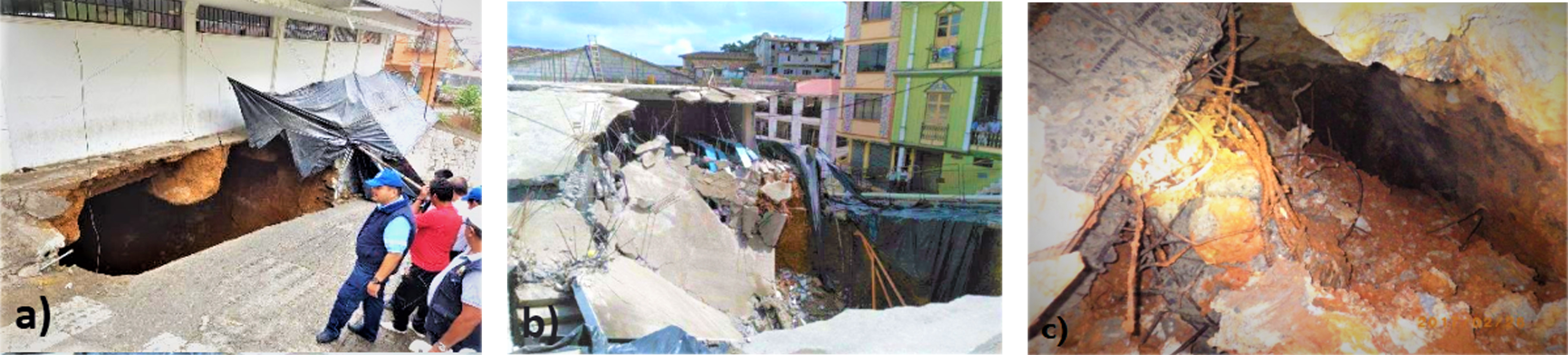 Figura 2 a) Inicio de colapso con un cono de 10 m. b) Desestabilización de estructuras. c) Escombros (columnas, mangueras, cables, bloques) dentro de la galería que provocó la subsidencia del terreno en superficie