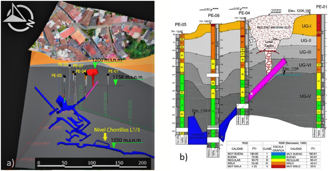 Figura 6 a) Modelo geológico-geotécnico en 3D. b) Sección entre los sondeos exploratorios PE-01, PE-04, PE-06, PE-05, donde se representa; 5 niveles de meteorización, RQD y la calidad del macizo rocoso según Bieniawski (1989)