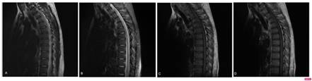 Figura 1 RM de columna torácica en proyecciones sagitales. Imagen hiperintensa en cordón medular desde C6 hasta T11 en secuencias T2 (A) y STIR (B); Imagen hipointensa en la misma localización en secuencias T1 (C) y T1 con contraste sin evidencia de realce (D).