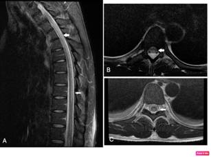 Figura 2 RM de columna torácica en proyección sagital en secuencia STIR (A) con Imagen hiperintensa en cordón medular desde C6 hasta T11. Proyecciones axiales en secuencia T2 que evidencian hiperintensidad medular de localización central y posterior en diferentes niveles () (B y C).