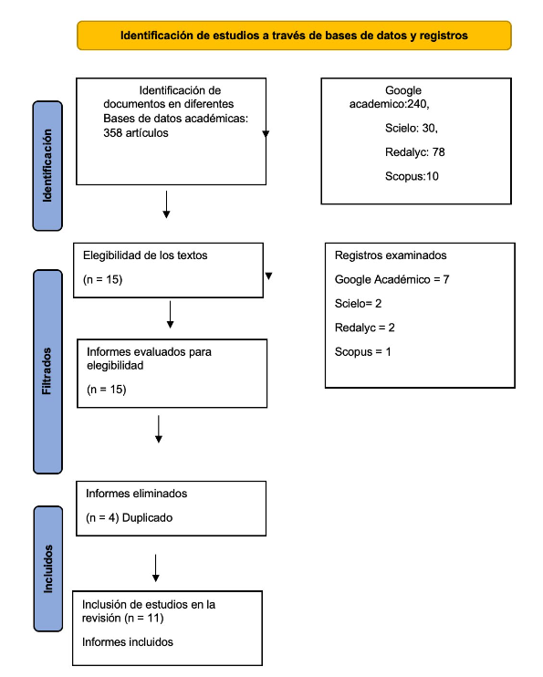 Se establecieron criterios de inclusión que permitieron seleccionar artículos científicos revisados en los últimos cinco años, específicamente entre 2019 y 2023, con el objetivo de mantener la actualidad y relevancia de los datos analizados. Asimismo, se incluyeron artículos originales en español e inglés, seleccionados de bases de datos como Scielo, Scopus, Redalyc y el buscador Google Académico.