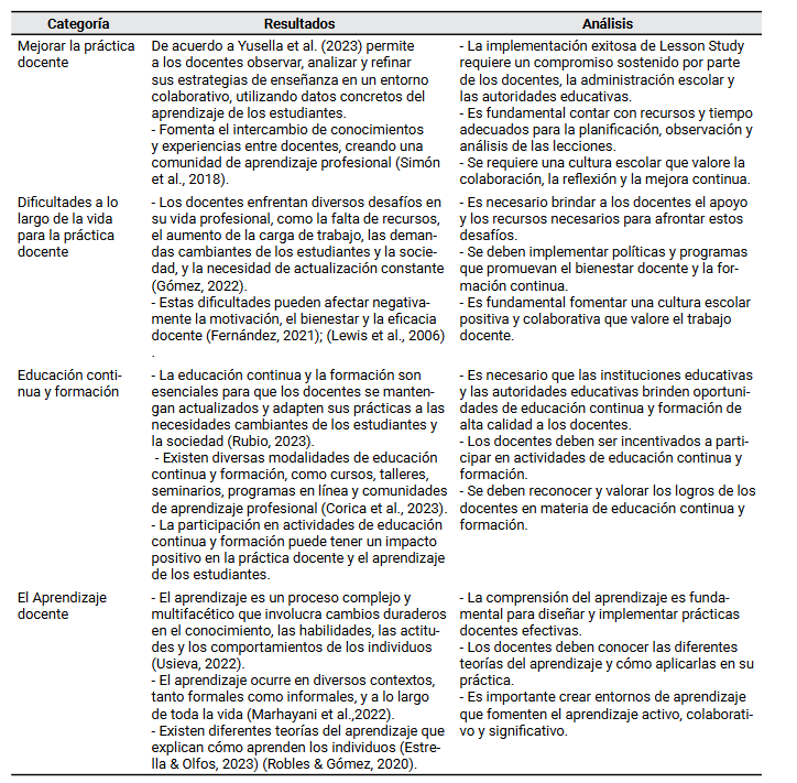 La metodología Lesson Study ha ganado atención en los últimos años como una estrategia innovadora para la mejora docente. Se trata de un ciclo de colaboración que permite a los profesores planificar, implementar, observar y reflexionar sobre su práctica docente. Este enfoque, fundamentado en la investigación y la colaboración, ha demostrado ser beneficioso para mejorar la enseñanza y el aprendizaje. De tal manera que para la discusión de este estudio se ha planteado realizarla dividiéndola en categorías.